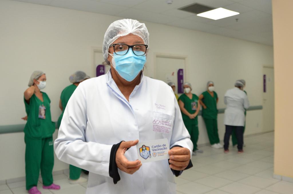Vera Moreira, 60 anos, é a responsável pelo setor de processamento de roupa do Hospital da Mulher, em Maceió. Ela foi a primeira servidora do HM a ser vacinada nas dependências da unidade e conta que a sensação de receber o imunizante foi como renascer. “É uma sensação indiscutível. Foi como um turbilhão de emoções, que não dá para descrever”, descreve.